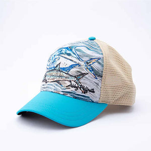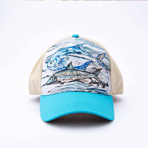 But what really sets this hat apart is the striking original artwork on the front panel. Featuring a beautifully rendered Permit and Bonefish in Abby's signature Batik artistic style, the design is both eye-catching and elegant. The blue and white color scheme complements the artwork perfectly, making this hat a true work of art.