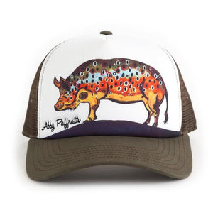 The Original Brown Trout Pig Hat! When you catch a Brown trout as big as a hog it's a good day. This unique pig brown trout hat showcases Abby's vision of what a trout pig might look like on the hoof!